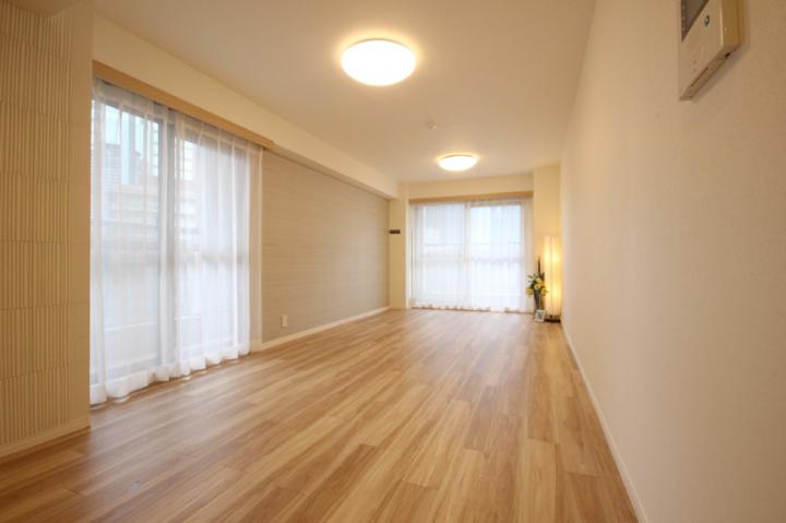 ◆2面採光の明るいリビングダイニングは、テーブルやソファ・テレビなど家具の配置がしやすいシンプルな縦長空間です