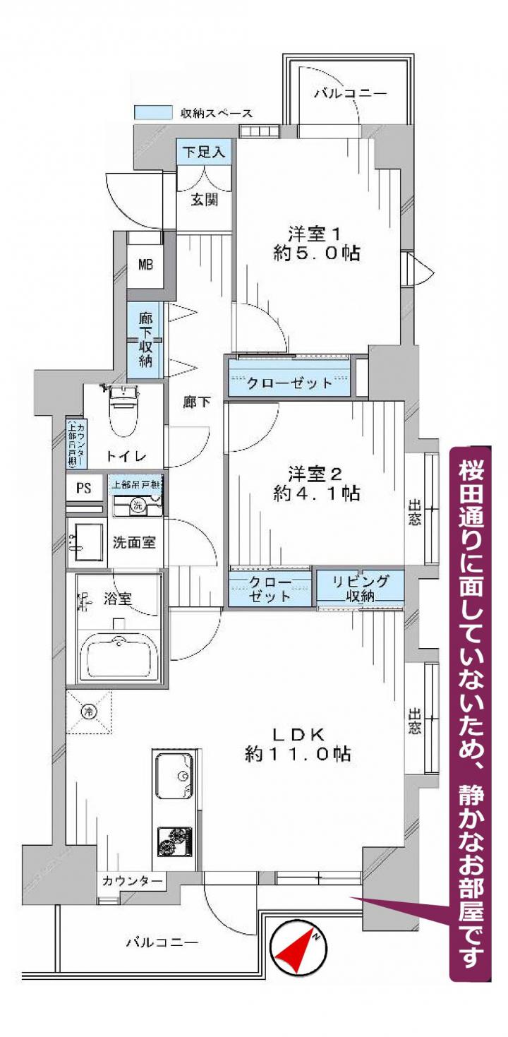□二面バルコニー!桜田通りの面してない静かなお部屋!
